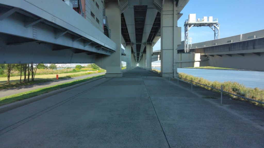 終始、高速道路の下を走りますが、周りに風を遮るものが無く、海に近いところは強い風が吹きやすく要注意です。コース上はきれいに整地されており、人も少ないので走りやすいです。