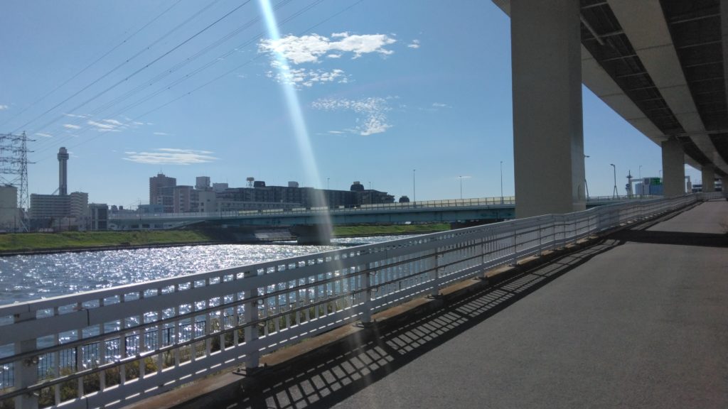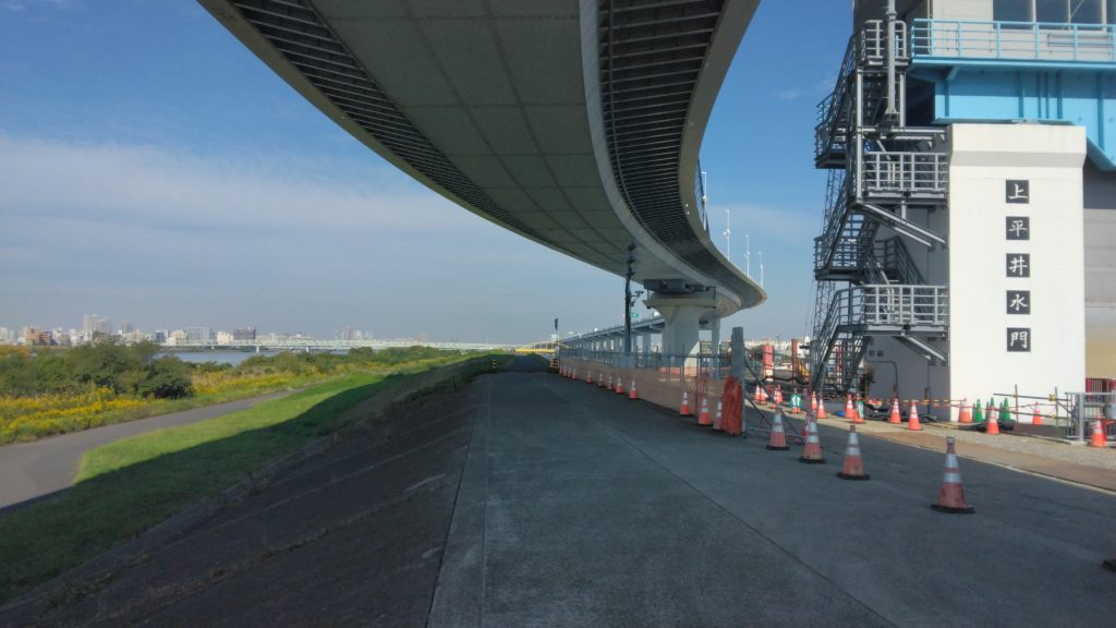 約1.5km先の上平井水門のところで首都高速とコースが分岐したため折り返し南下します。