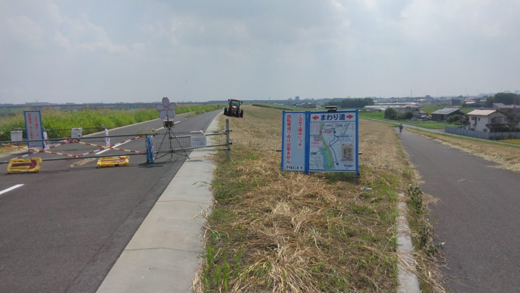 出発早々、サイクリングロードが工事中のためこの先通行できないようです。仕方なく看板に標示されている迂回路を進みます。看板には2023年10月まで通行止めと書いてありました。