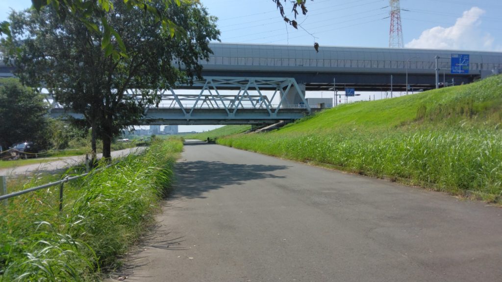 葛飾大橋と東京外環自動車道が見えてきました。河川敷に下るコースを進みます。