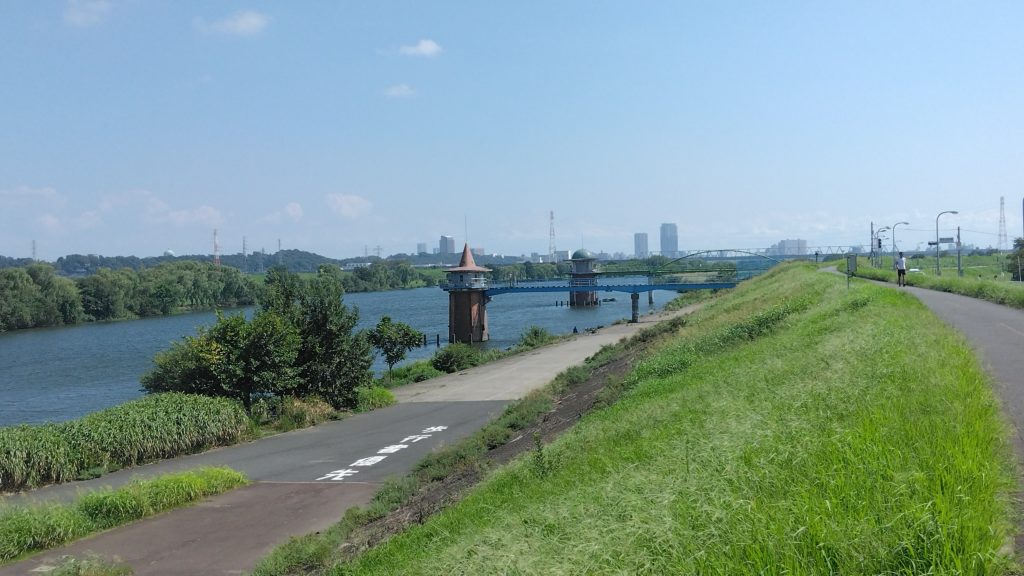 流山橋が見えてきました。河川敷に下るコースを進み流山橋と武蔵野線の下をくぐります。