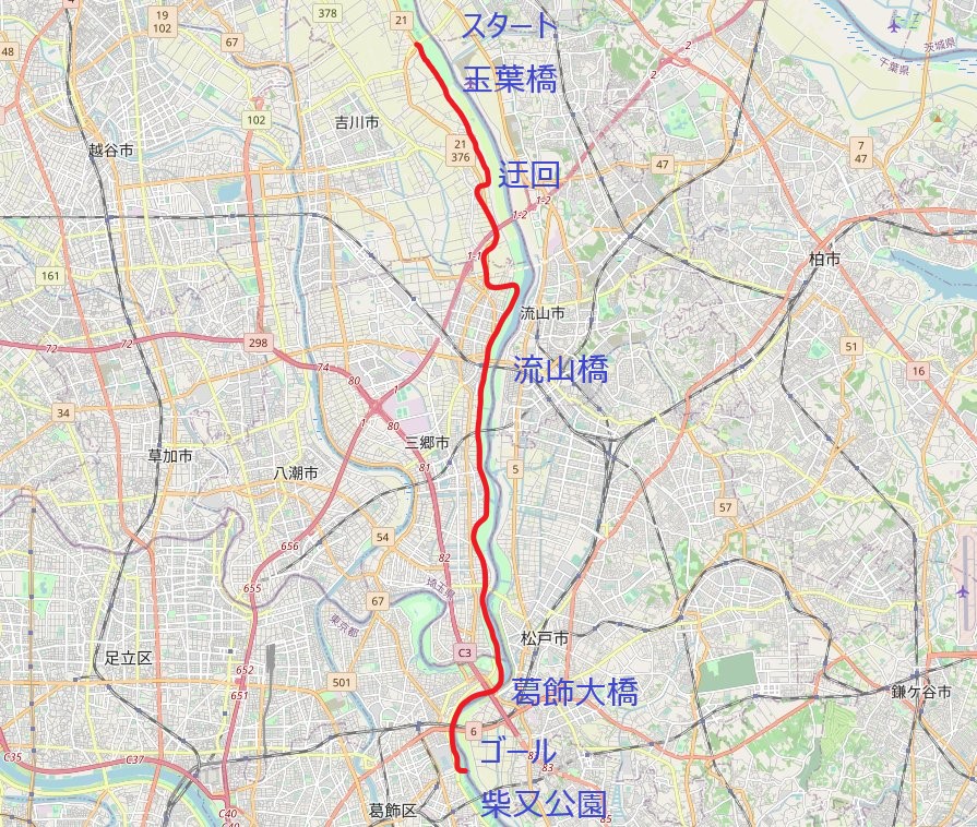 本日のコースとなります。前回は玉葉橋を関宿に向かって北上しましたが今回は柴又公園を目指し南下します。
