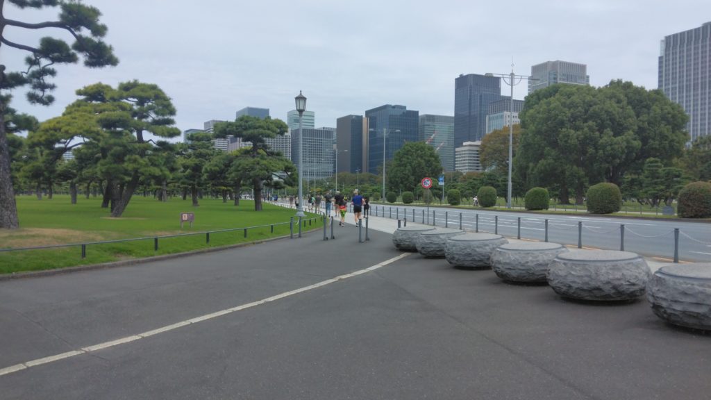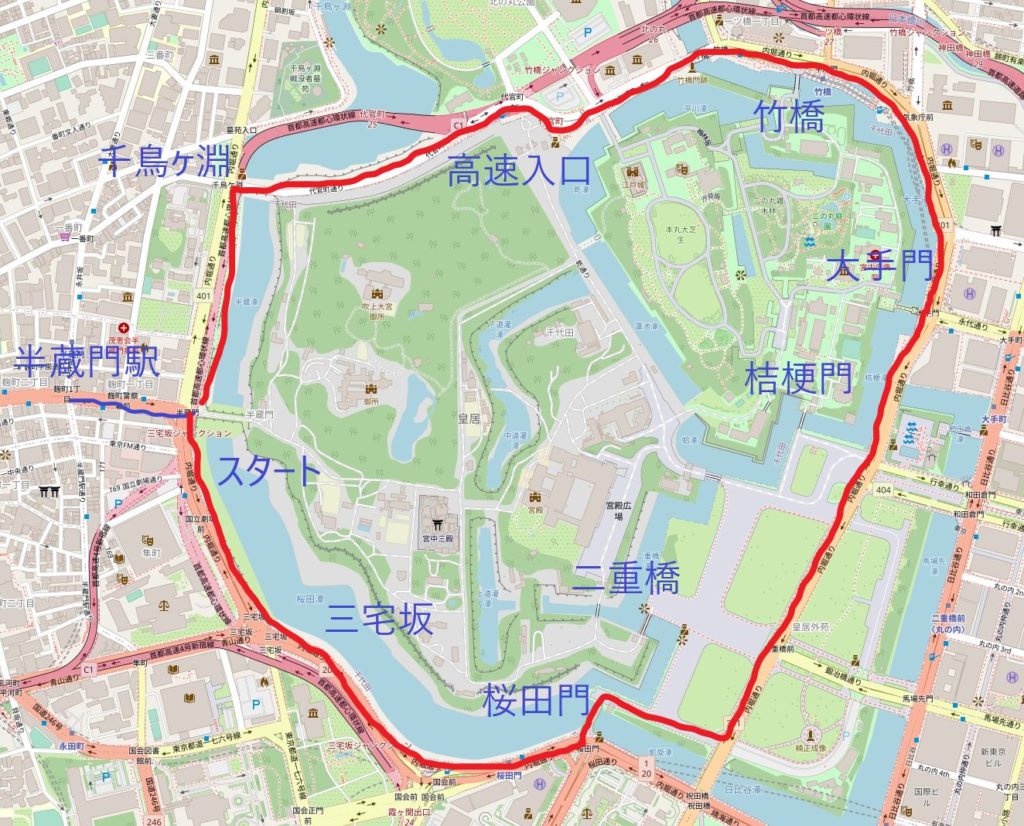 This is today’s course. Proceed counterclockwise in front of Hanzomon. Counterclockwise is the etiquette for jogging at the Imperial Palace, so make sure not to make that mistake. It is a 5km course.
