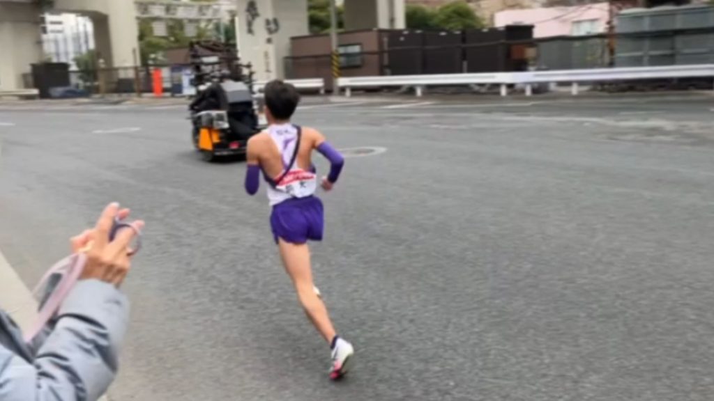 700m北上すると比較的空いているエリアがあったので、そこで応援することに… しばらくすると先頭が通過していきました。