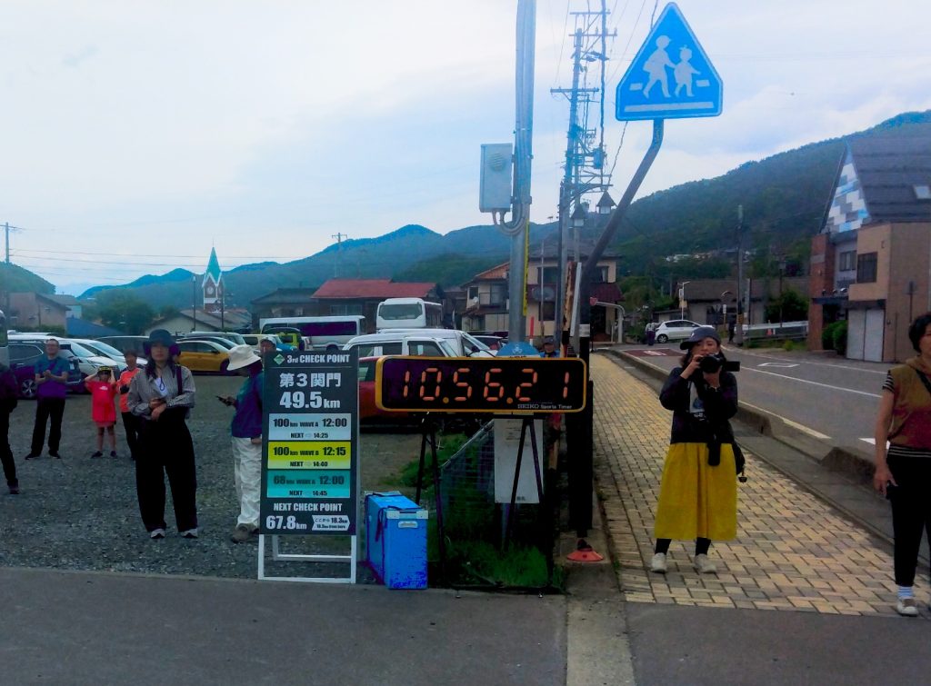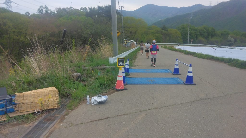 90km手前から上り基調となり、最後の踏ん張りどころです。普段なら、なんてことない坂ですが、走っても辛い、歩いても辛いです。残り5km地点で、マイク🎤音が聞こえる会場のすぐ側を一旦通り過ぎます。⇒精神的に少し辛い…