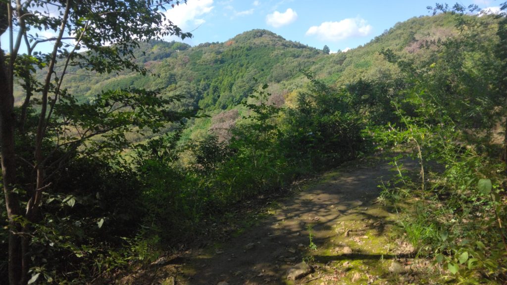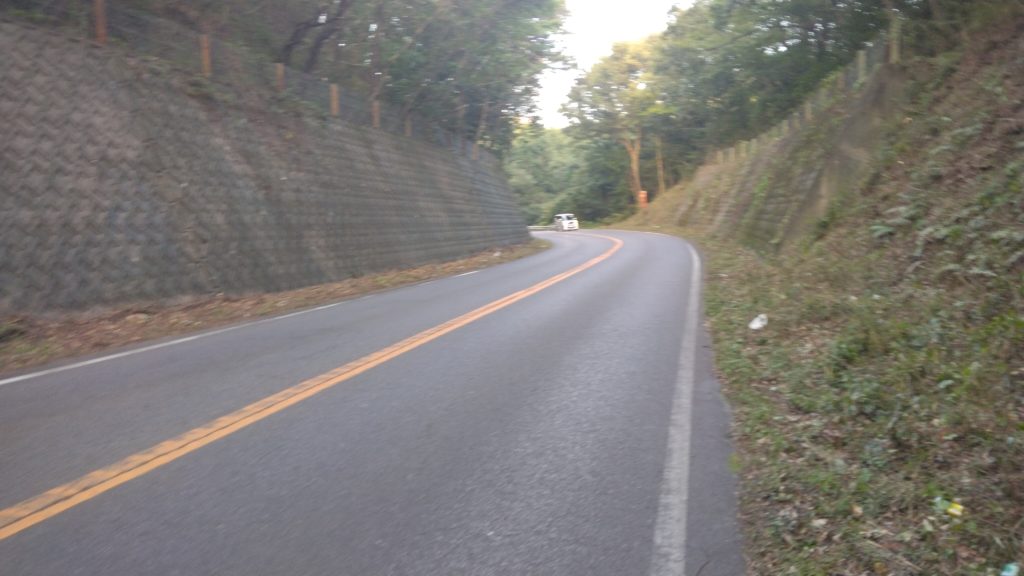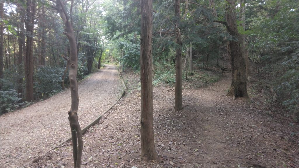 14時58分 太平山を少し下ると、左手にある広めの車道と隣合わせになります。どちらを行っても大丈夫です。敢えて右側の山道を進みます。