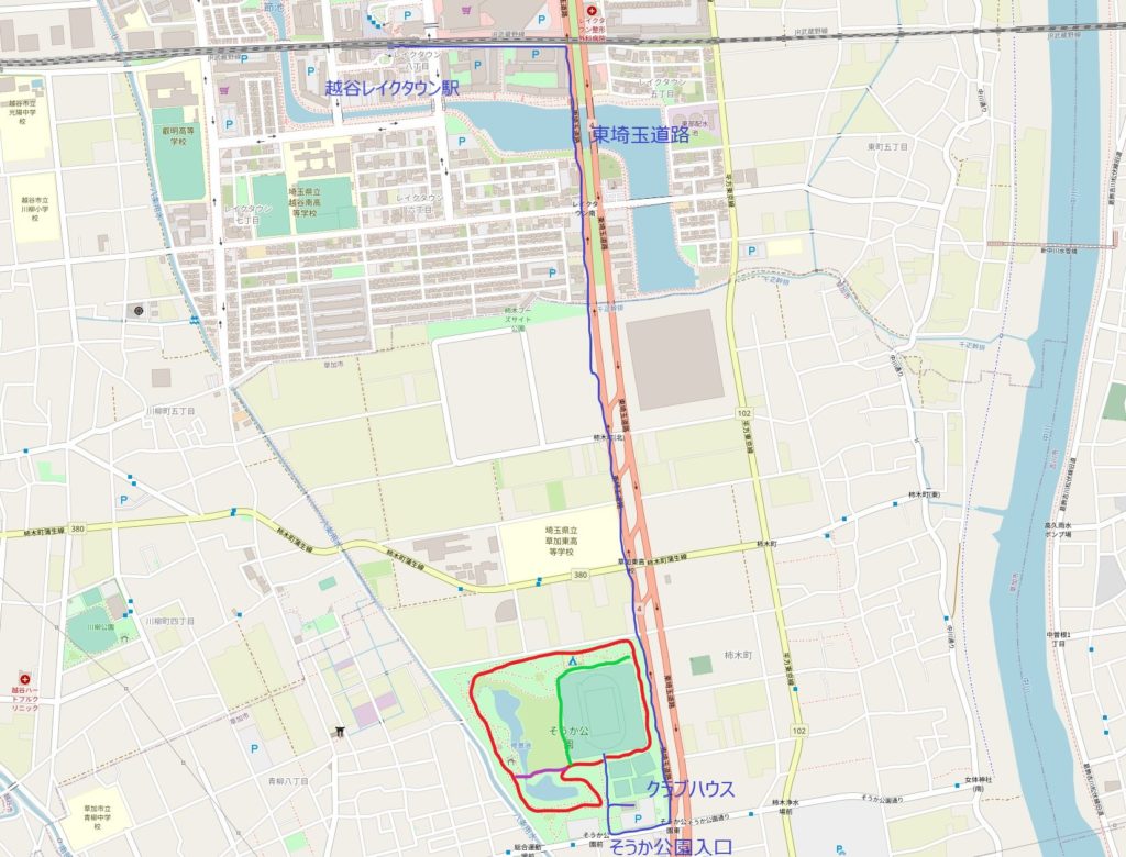越谷レイクタウン駅を東へ300m進むと東埼玉道路にでます。東埼玉道路を南方向に1.5km歩くと約20分くらいでそうか公園に到着します。