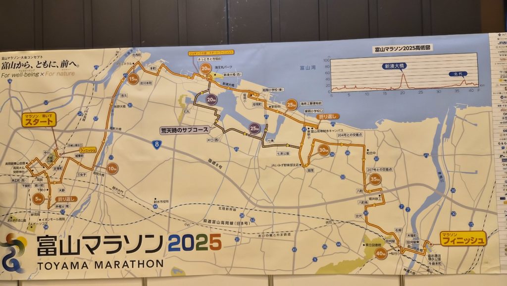 明日走る富山マラソンコースも貼ってありました。新湊大橋のアップダウンが気になりますが、そこ以外は平坦なようです。