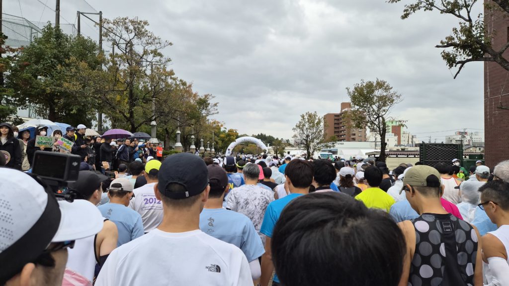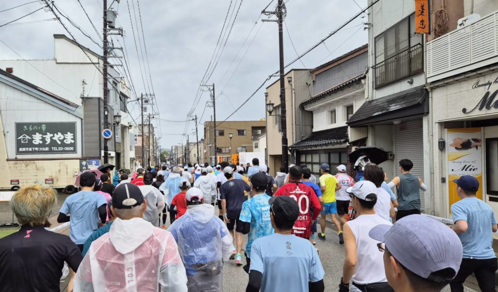 スタート会場へは、JR氷見線もしくはあいの風とやま鉄道「高岡駅」から徒歩で約20分くらいで到着しました。会場で荷物を預け、スタートブロックへ…