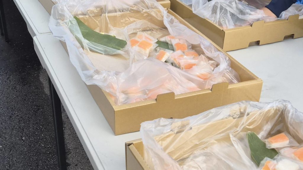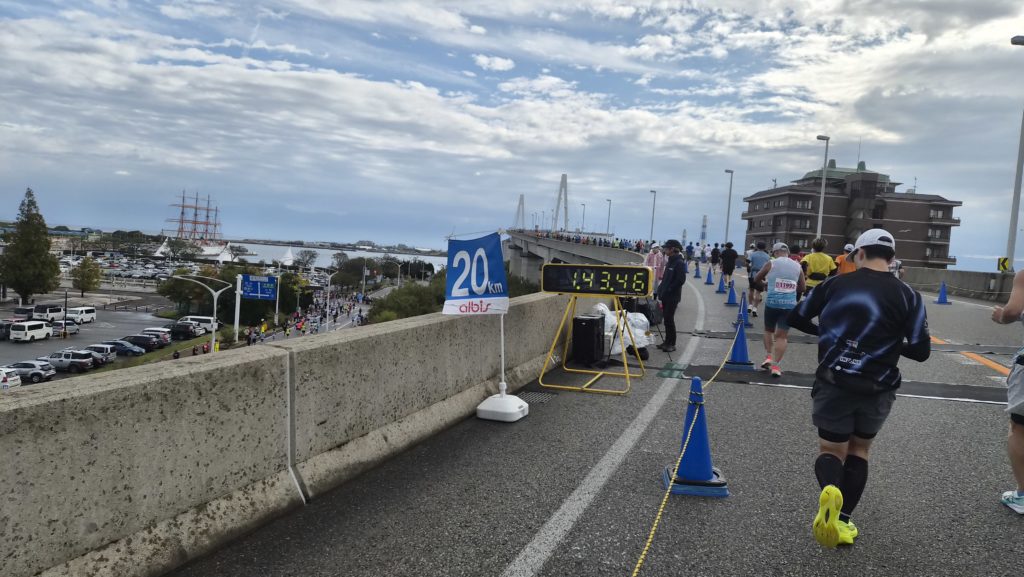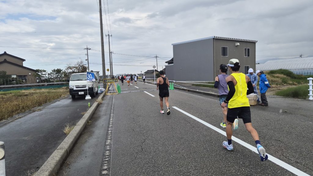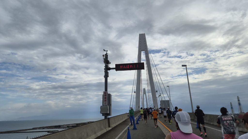富山マラソン名物のますずし、いなり寿司をゲット。ここのエイドは充実していて、どれも美味しいです。新湊大橋のアップダウンを前に、少し腹ごしらえです。
