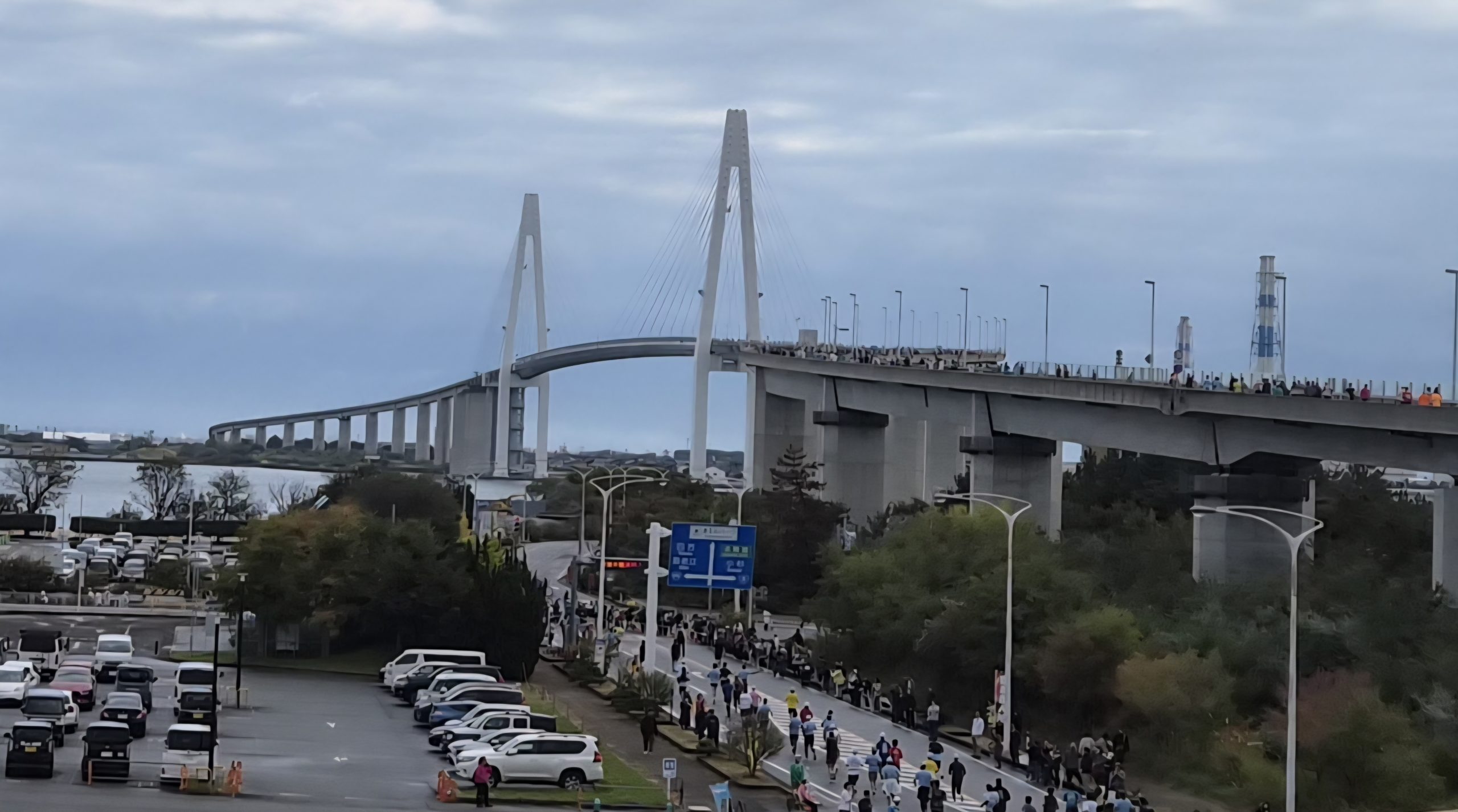 最後の難関、富山北大橋のアップダウンです。足が攣りそうなので、さらにゆっくり走ります。本当に辛い😢