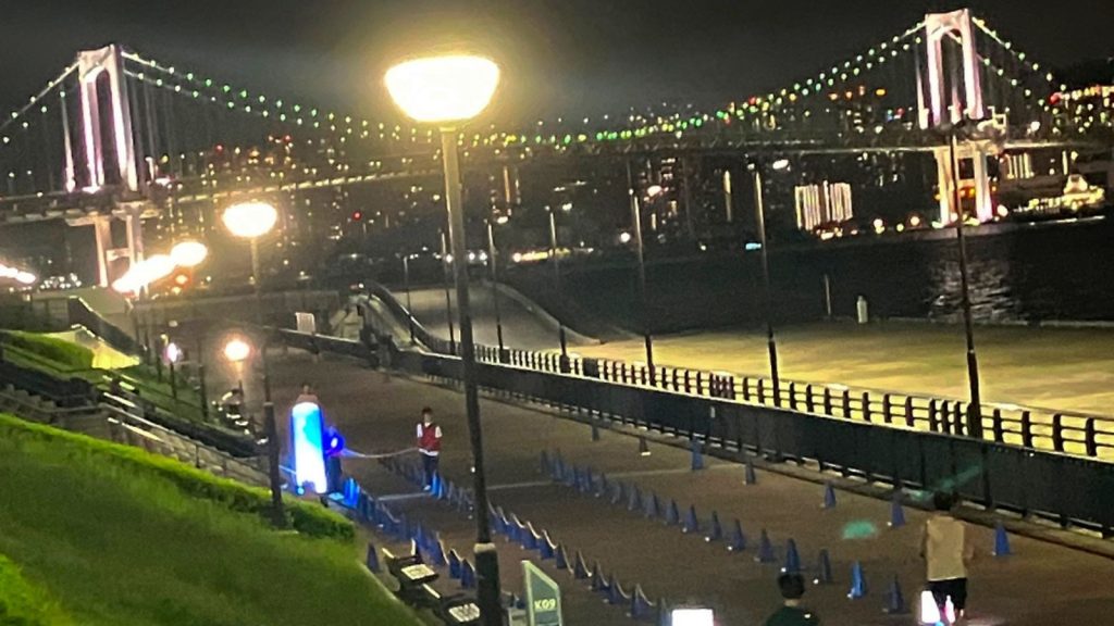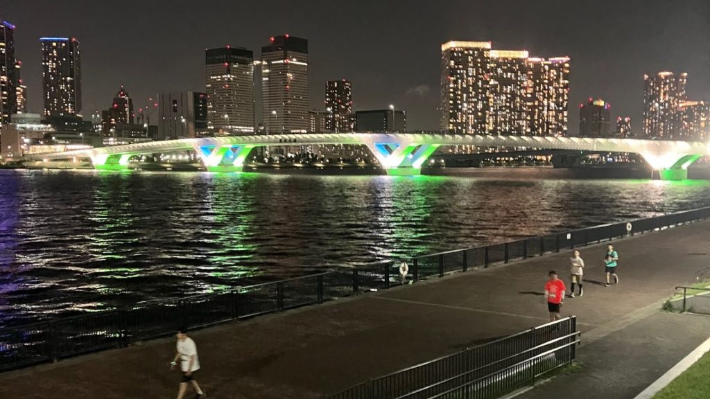 フルとハーフは午後6時にスタート、10kmと5kmは午後7時スタートです。混雑していたのは、スタート直後だけで、他はストレスなく走ることができました。レインボーブリッジや高層ビル群の夜景がとても綺麗で、走りの辛さを一瞬忘れさせてくれます。