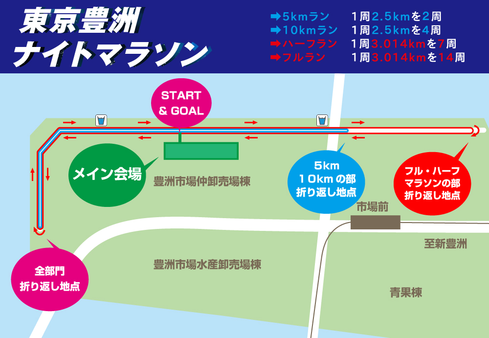 種目は、フル、ハーフ、10km、5kmがあり、今回はハーフに出場。ハーフは1周3kmを7周するようです。